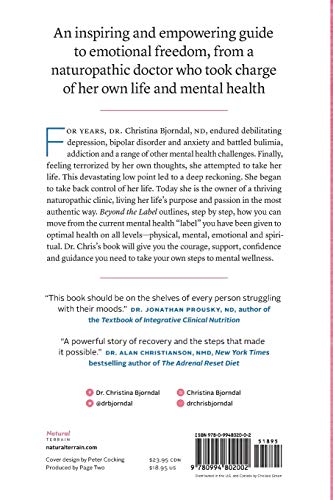 For years, Dr. Christina Bjorndal, ND, endured debilitating depression, bipolar disorder, and anxiety and battled bulimia, addiction, and a range of other mental health challenges. Finally, feeling terrorized by her own thoughts, she attempted to take her life. This devastating low point led to a deep reckoning. She began to take back control of her life. Today she is the owner of a thriving naturopathic clinic, living her life’s purpose and passion in the most authentic way. In Beyond the Label, Bjorndal outlines, step-by-step, how you can move from the current mental health “label” you have been given to optimal health on all levels – physical, mental, emotional, and spiritual. Dr. Chris’s book will give you the courage, support, confidence, and guidance you need to take your own steps to mental wellness.