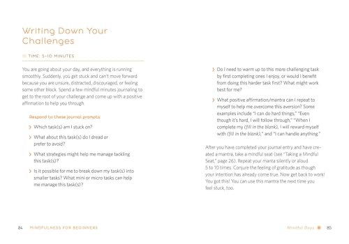 Bite-sized exercises—Learn exercises that you can do in 10 minutes or less, like breathing techniques, meditations, journaling, and yoga poses.Guided practices—Explore mindfulness step-by-step by setting intentions, breathing slowly, walking mindfully, releasing tension, savoring food, and much more.All-day mindfulness—Begin your morning in peace, end your evening with joy, or recenter yourself any time with this guide to mindfulness for beginners.